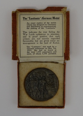Inside the lid is the explanation: "The Lusitania" (German) Medal, an exact replica of the medal which was designed in Germany and distributed to commemorate the sinking of the "Lusitania". This indicates the true feeling the War Lords endeavour to stimulate, and is proof positive that such crimes are not merely regarded favourably, but are given every encouragement in the land of Kultur.'