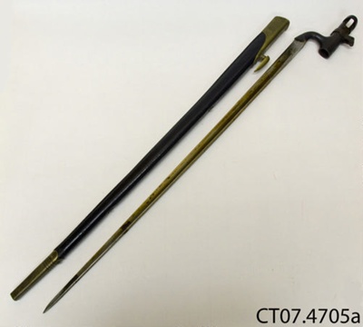 About this objectBayonet; a World War One, socket bayonet with leather and brass scabbard. This belonged to Sergeant Major Georgia Francisco Almond Sargeant, of Owaka, who fought in World War One.